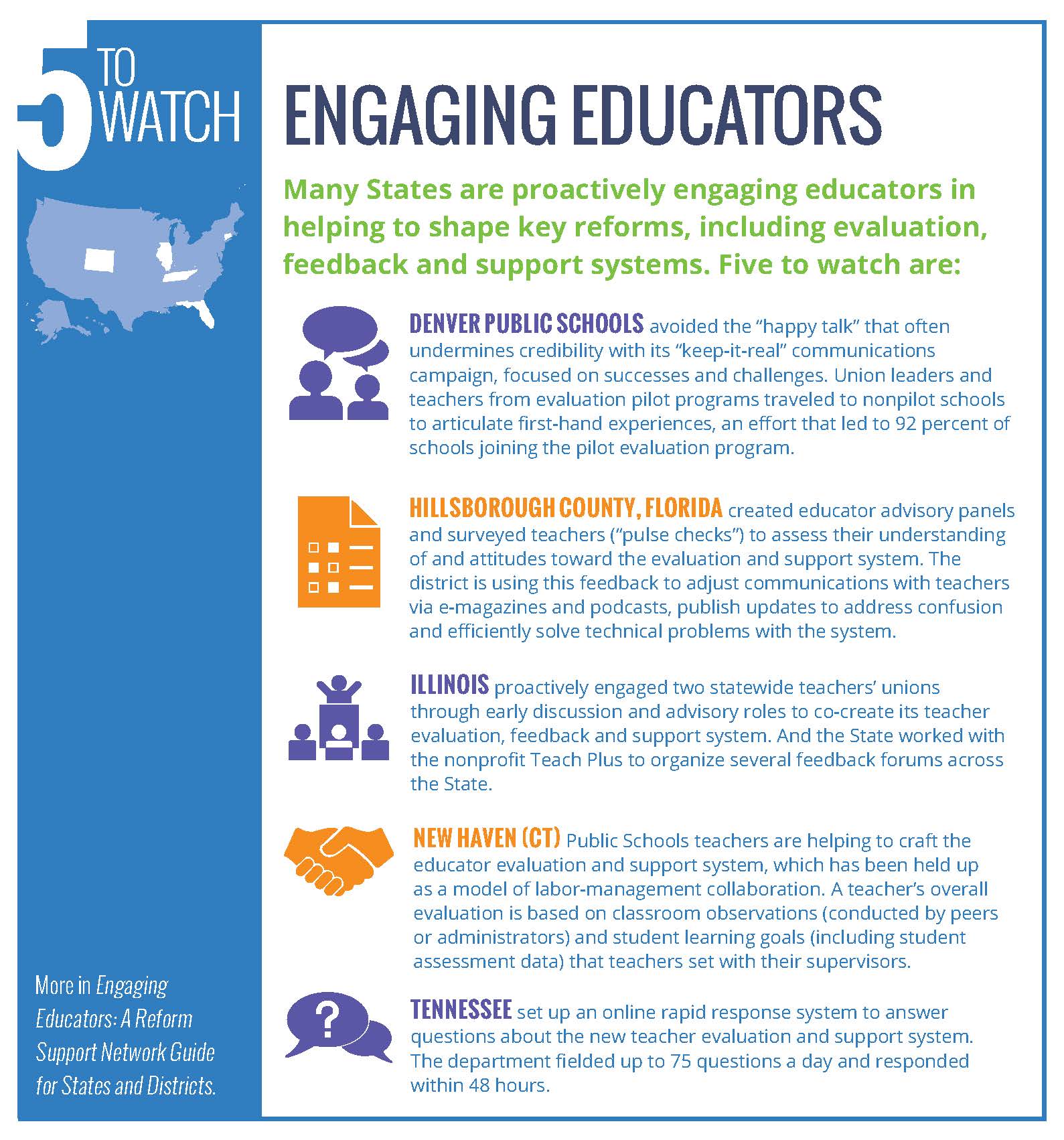 For more details, follow this link for the full pdf: Engaging Educators: A Reform Support Network Guide for States and Districts.