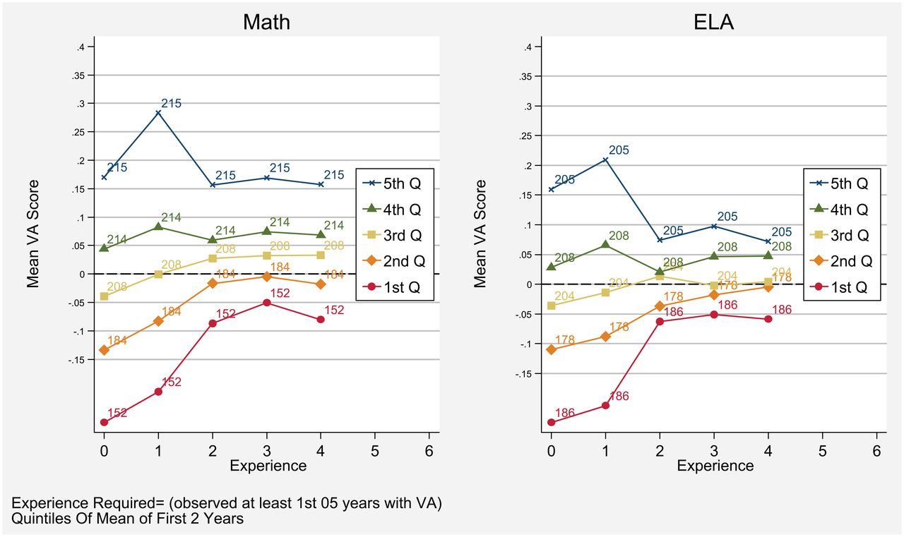 - Even though low-performing teachers improve markedly after year one in the classroom, the average low-performing teacher, measured by year one results, never catches up in effectiveness – in years two, three, or four – to the level of effectiveness of a median first-year teacher (see chart below).
