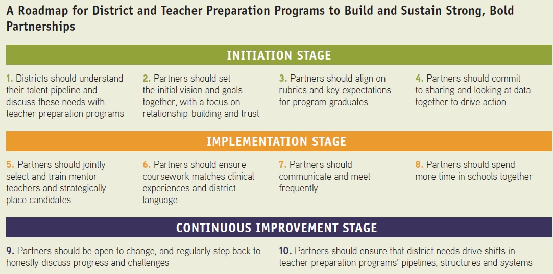 These stages provide an overview, but the report itself holds specific examples and advice from a number of national teacher preparation experts and features seven leading partnerships.