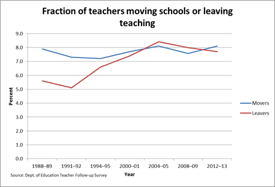 To set the stage, this chart below is taken from data from the “Teacher Follow-up Survey” (TFS) of the School and Staffing Survey, which is administered to school teachers nationwide every four years by the U.S. Department of Education.